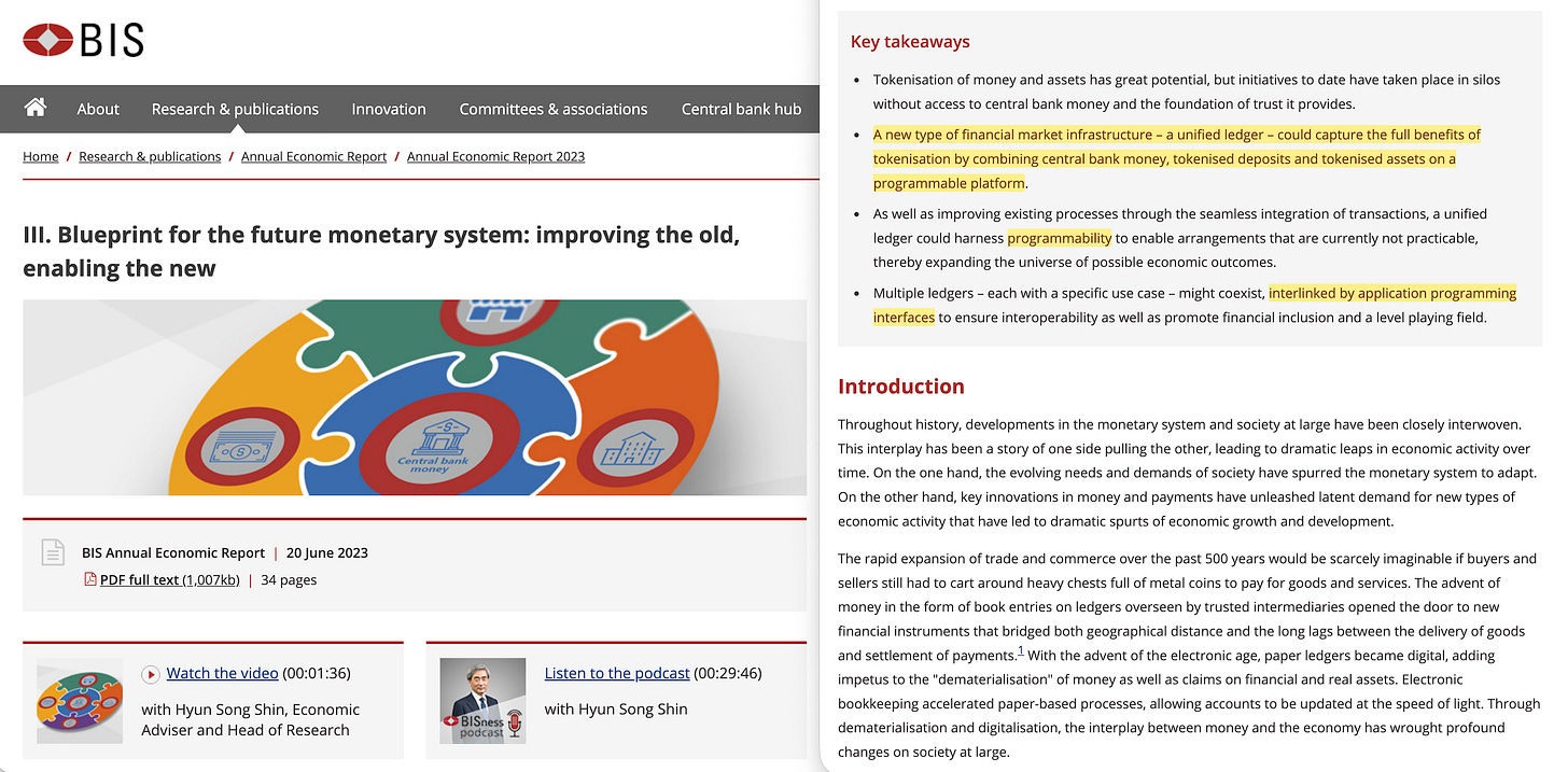 Die BIZ hat ihr „ einheitliches Hauptbuch “ 46 als eine gemeinsame programmierbare Plattform beschrieben , auf der digitale Zentralbankwährungen, tokenisierte Einlagen von Geschäftsbanken und tokenisierte Vermögenswerte – Wertpapiere, Anleihen, wahrscheinlich auch Immobilien – koexistieren und atomar abgerechnet werden.