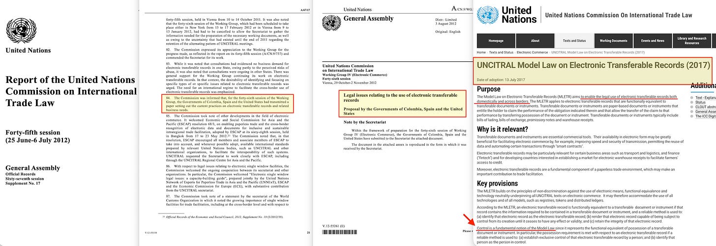 Im Jahr 2011 reichten die Regierungen Kolumbiens, Spaniens und der Vereinigten Staaten einen gemeinsamen Vorschlag bei der UNCITRAL-Arbeitsgruppe IV ein , dem Gremium der Vereinten Nationen, das für die Entwicklung des internationalen Handelsrechts zuständig ist. Der unter der Aktennummer A/CN.9/WG.IV/WP.119 dokumentierte Vorschlag befasste sich mit „ Rechtsfragen im Zusammenhang mit der Verwendung elektronischer übertragbarer Datensätze “ . Innerhalb von sechs Jahren entwickelte die Arbeitsgruppe daraus das UNCITRAL Modellgesetz über elektronische übertragbare Datensätze (MLETR) , das 2017 verabschiedet wurde .