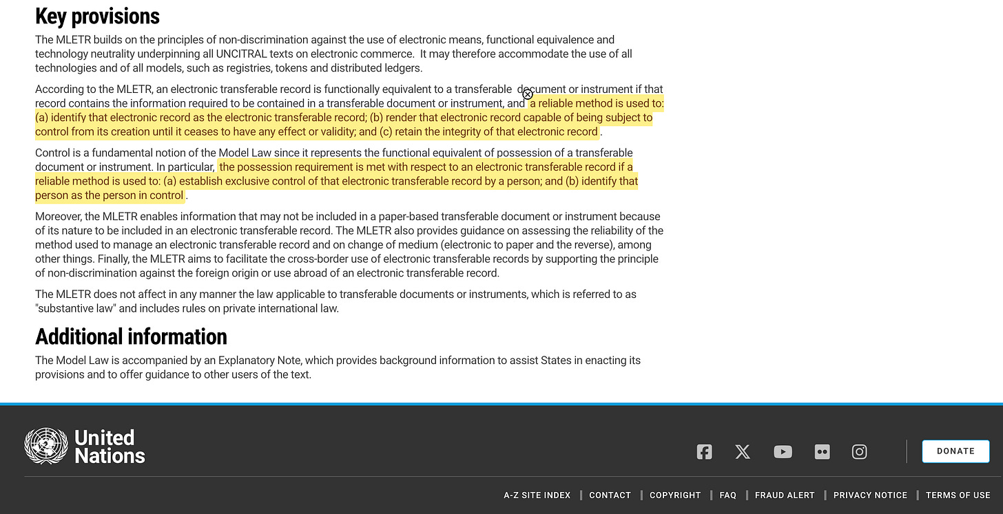 MLETR übernimmt das Kontrollkonzept aus dem amerikanischen Handelsrecht und macht es zum globalen Standard für elektronische Handelsdokumente und übertragbare Aufzeichnungen . Gemäß dem Modellgesetz ist eine elektronische Aufzeichnung nur dann einem Papierdokument rechtlich gleichwertig, wenn ein „ zuverlässiges Verfahren “ nachweist, dass eine identifizierbare Person die ausschließliche Kontrolle darüber besitzt.