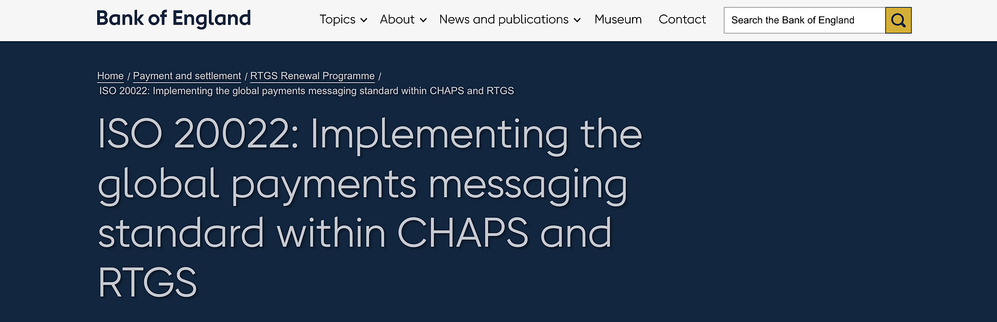 Diese Systeme sind so konzipiert, dass sie über gemeinsame Datenstandards miteinander kommunizieren können , insbesondere über ISO 20022 53 , ein Nachrichtenformat, das nicht nur Zahlungsbeträge, sondern auch Metadaten enthält, die den Zweck der Transaktion, ihre Herkunft und ihren Konformitätsstatus beschreiben.